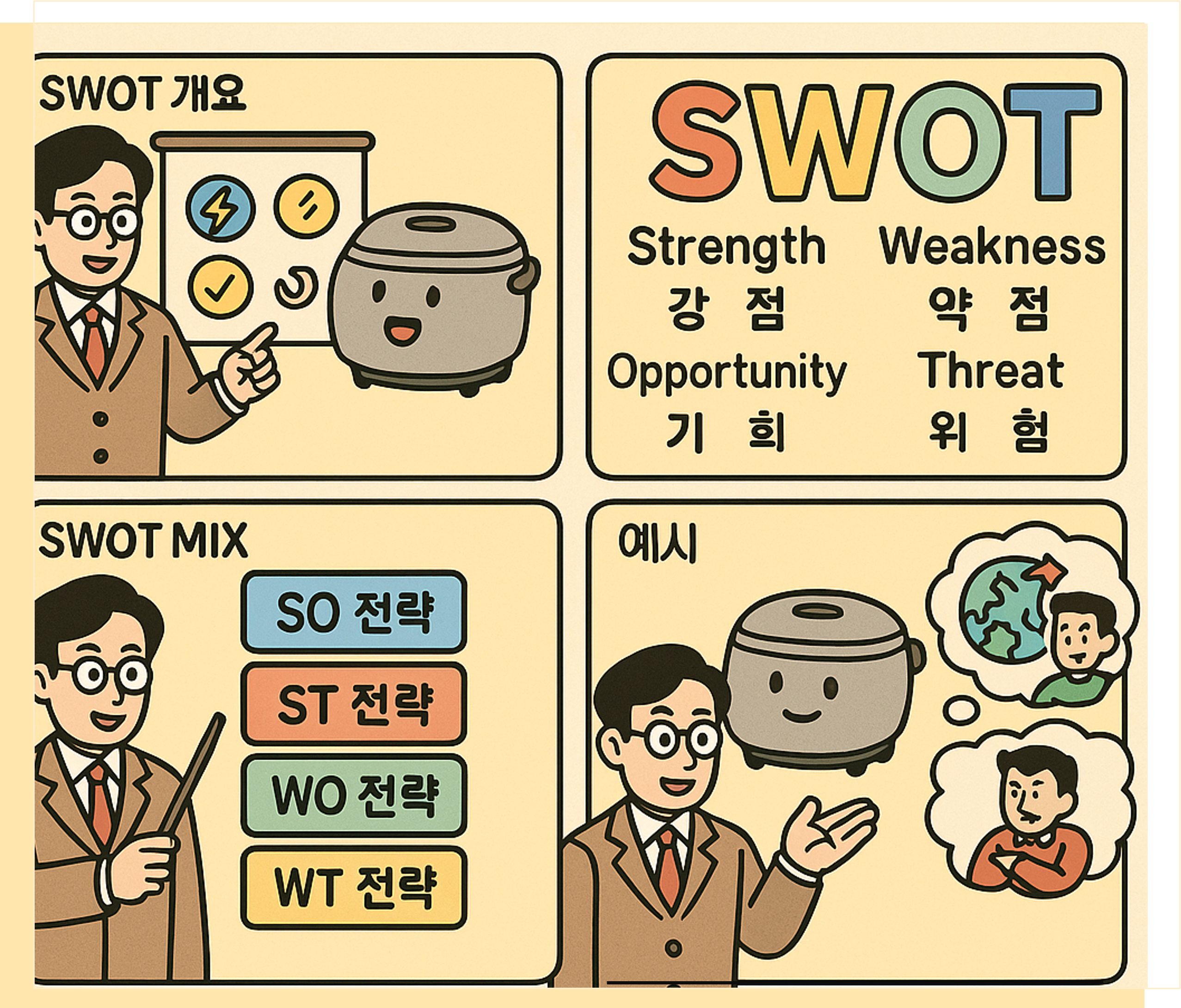 SWOT 분석 이해하기- 한국밥솥 해외전략 수립하기한국 밥솥, 왜 세계인이 주목할까?빅보스쌤이 유튜브를 보다 보니 최근에 띄는 현상이 있습니다.한국산 전자제품, 특히 밥솥, 김치냉장고, 세탁기 등 생활가전의 수요가 폭발적으로 증가하고 있으며,미국, 일본, 동남아 마트에서는 한국산 밥솥이 품절되거나 사재기 현상까지 발생하고 있습니다. 🎯 소비자들은 "한국 밥솥은 밥이 다르다"며 입소문을 내고 있고,요리사들은 음식의 품질을 높일수 있고 다양한 요리를 만들어 볼 수 있는 장점들이 있어"K-푸드" 열풍과 맞물려 고급화된 전자제품에 대한 선호가 확산되고 있는 상황입니다. 이러한 기회를 앞에 두고 한국 밥솥 브랜드는 단순히 물건을 더 많이 파는 수준을 넘어,글로벌 무대에서 지속 가능한 성장 전략을 수립해야 할 시..